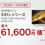 2026年4月8日(水)までの期間限定で、ブラビアX75WLシリーズが通常価格より最大36,300円お買い得になるタイムセールが開催中です。