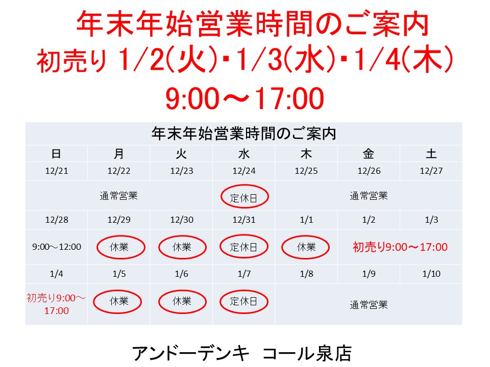 アンドーデンキコール泉店【宮城県】 アンドーデンキコール泉店の年末年始のスケジュール上記の通りとなります。 1月8日から通常営業となります、よろしくお願いします。 〒981-3133 宮城県仙台市泉区泉中央4-24-1 TEL:022-375-6050 E-Mail:call@andodenki.net 営業時間:9:00-18:00 定休日:水曜日
